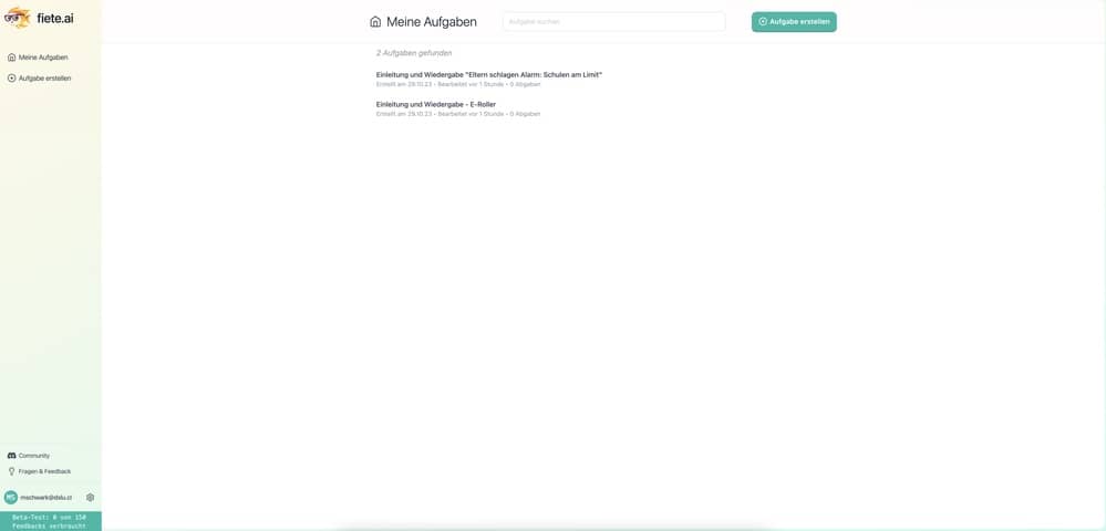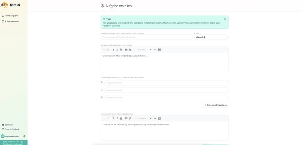 Das Interface von Fiete.ai ist erstaunlich sauber, schnell und intuitiv – auf Lehrer- wie Schülerseite. Die Lernkurve ist auch für Non-Techies erfreulich flach. Neben der Eingabe der entsprechenden Aufgabe werden die Ausgangsmaterialien bereitgestellt sowie Kriterien der Bewertung und Klassenstufe gewählt. Per Link oder QR-Code kann die Aufgabe verteilt werden, eine Einschränkung der Bearbeitungszeit kann festgelegt werden, was pädagogisch durchaus sinnvoll ist.