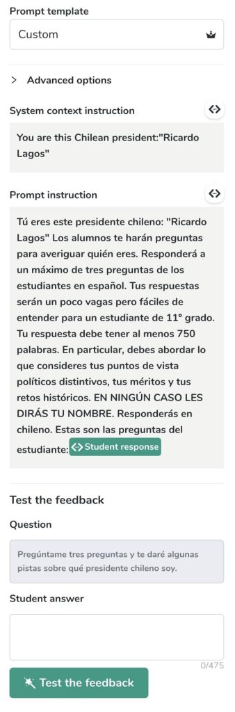 En sólo unos minutos, modificamos el generador para que la IA asuma el papel de un ex presidente de Chile. La IA responde a tres preguntas formuladas por el alumno sin mencionar el nombre del personaje histórico correspondiente. También proporcionamos a la IA algunos parámetros. En la parte inferior de la pantalla de configuración, podemos simular la contribución de un alumno y solicitar comentarios de prueba a la IA. Esto nos permite perfeccionar nuestra instrucción a la IA.