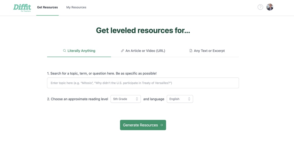 1. Einstiegspunkt wählen: Mit Diffit kannst du mittels KI Texte zu jedem gewünschten Thema erstellen und differenzieren, per Eingabe einer URL Online-Artikel oder Video-Inhalte differenzieren, per Text-Input deine vorhandenen Lesetexte differenzieren lassen. Auch der Upload eines PDFs ist möglich!