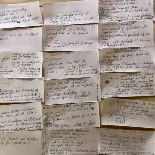 Ahora muestra un cartel o una presentación digital del año anterior. Después, vuelve rápidamente a los trozos de papel. Lee algunas sugerencias de forma anónima. ¿Es un tema interesante, es ya una pregunta concreta? ¿Qué otras cuestiones concretas son concebibles? ¿Es posible responder a esta pregunta en 5 minutos, qué opinas?