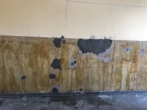 Tras la suspensión de las clases durante dos días debido a un incendio en el colegio, continúo solo, sin alumnos. Se retira el resto del antiguo revestimiento de plástico. El siguiente paso es lijar todas las paredes, rellenarlas y luego pintarlas.