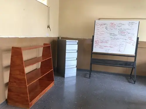 Tercer día. Equipamos los cojines del rincón de trabajo con fundas recién cosidas, integramos un viejo armario metálico donde guardamos el material de trabajo por curso. Preparamos y probamos el nuevo diseño de la sala. Recogemos ideas para seguir diseñando y actualizamos la lista de tareas.