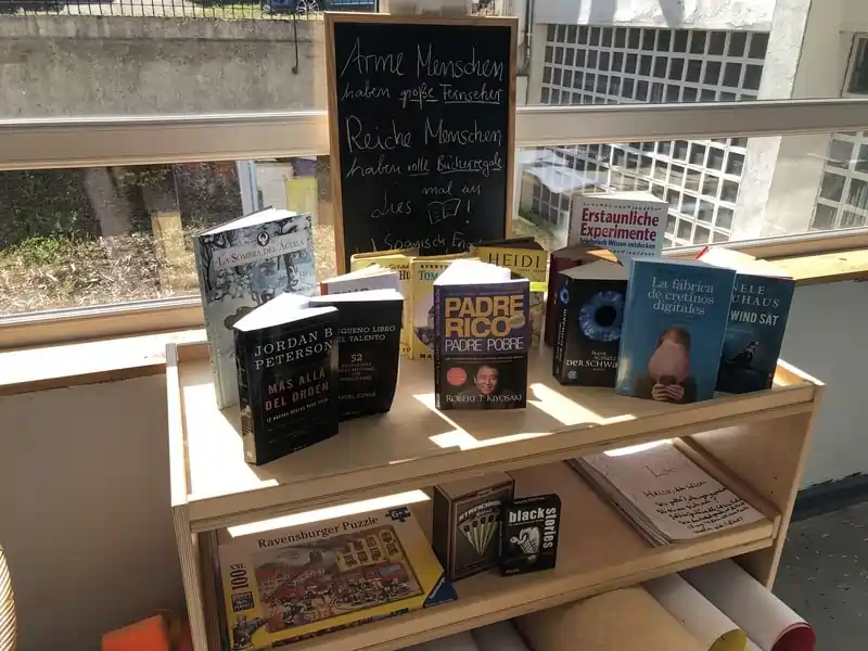 En las dos últimas semanas se han añadido numerosos detalles difíciles de reconocer en las fotos. Pero, sobre todo, muchas gracias a nuestros auxiliares, que nos han pintado la habitación. El rincón de lectura ha recibido otra mesa, y ya se han ordenado y guardado muchos materiales didácticos. Lo que falta ahora, sin embargo, son varios juegos interactivos, algunos de los cuales también se integrarán en el diseño de paredes y mesas.