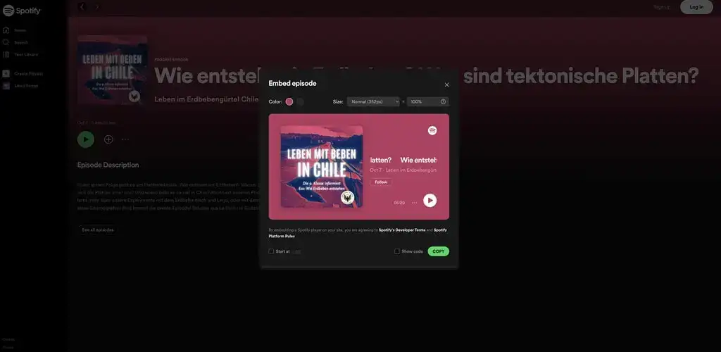 Quizá quiera publicar los trabajos realizados con éxito en el sitio web de su colegio o en otro lugar de Internet… Entonces, haga clic en el episodio en Spotify y luego en los tres puntos junto al botón verde de reproducción. Aquí puede configurar un reproductor y luego copiar el código HTML. A continuación, basta con incrustar este último en cualquier otro sitio web.
